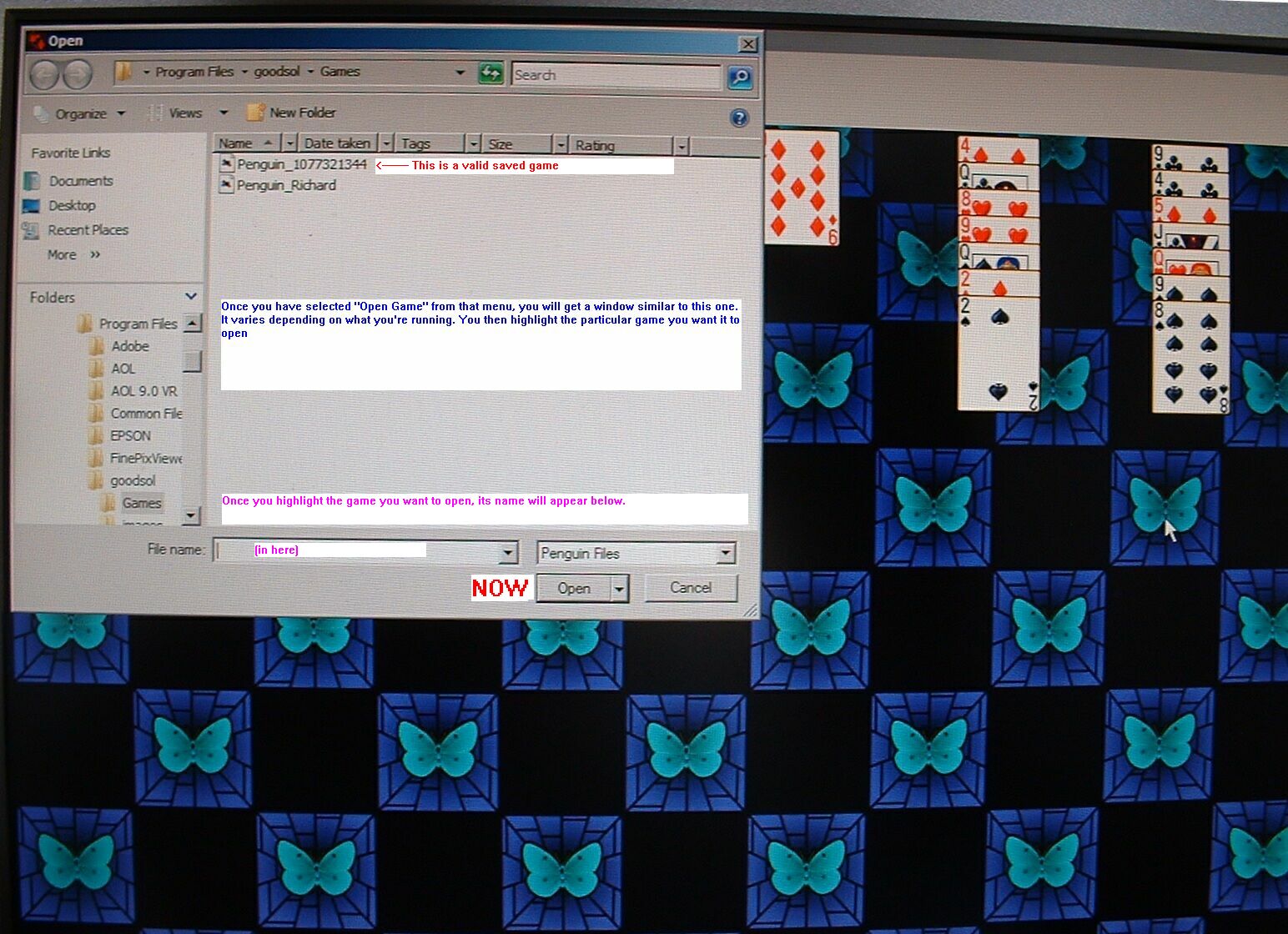 OK Pauline. We'll start from scratch. You're gonna kick yourself when you see how easy this is. 1/. Open up Pretty Good Solitaire as normal. 2/. Open Penguin as you normally do. 3/. The last game of Penguin you were playing will be on your screen, with cards dealt out and everything. 4/. Look up to the top left of that screen. 5/. Along the top you will see "Penguin,(Pauline)" 6/. Just beneath that you have "Game" "Options" "Internet" and "Help" 7/. Click the one that says "Game" 8/. A small menu will drop down at the top left of screen but you will still see part of the Penguin game beneath this. 9/. In this little menu, select "Open game" (6th from the top). 10/.Click it and a small window will appear. 11/. At the bottom there will be one box called "File name" 12/. This is where you have to paste the URL you want. 13/. Once you've pasted it in there, click on "Open" just to the right. 14/. Depending on your connection speed etc, this window will close and the online game will run on your PC, (replacing the Penguin game that was there previously). 15/. Don't move any of those cards. 16/. Go back up to the top of your screen and click "Game" again. 17/. In the menu that appears, select "Save as". 18/. It will choose the correct name for you and then you hit the "Save" button. You now have your own hard copy of this particular game that you can open at any time you want. 19/. Obviously it is a Penguin game, so in order to open it you must have Penguin open on your screen. 20/. Back up to the top left and hit "Game" 21/. Select "Open game" in the menu, and click the "Open" button. 22/. You will reach a point when you will have more that one saved Penguin in that window, so at that time you just highlight the one you want before you click the "Open" button. It is ESSENTIAL that you remain online when you're pasting in the URL, and until you've saved it within P.G.S. itself. Saving it to your desktop or anywhere else will just make it more difficult for you to put it into the correct program yourself. That's how you get "invalid file" messages. |